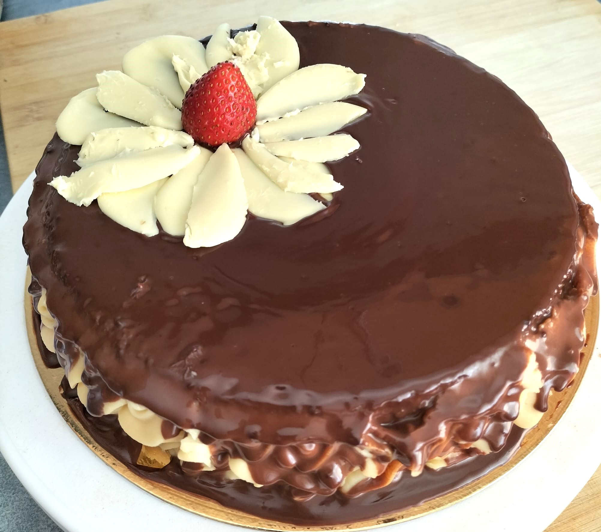 bizcocho de vainilla, relleno de crema pastelera, y cobertura de chocolate